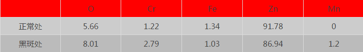 我們從上表來看,黑斑處的成分與正常處的成分相似。但黑斑處氧的成分比正常處多2%,黑斑處鋅的成分比正常處少了近5%,可以判斷黑斑處發(fā)生了氧化