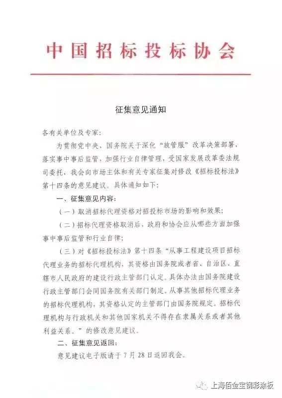 7月31日,受國家發(fā)改委法規(guī)司委托,中國招標(biāo)投標(biāo)協(xié)會將組織市場主體、業(yè)內(nèi)專家學(xué)者,就《招標(biāo)投標(biāo)法》第十四條關(guān)于工程招標(biāo)代理機(jī)構(gòu)資質(zhì)管理的條款修訂收集意見。
