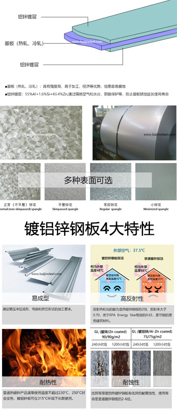 熱鍍鋁鋅鋼板是以各種強度和厚度規(guī)格的冷軋鋼板為基材,連續(xù)熱鍍鋁鋅生產(chǎn)線生產(chǎn)的、由鋁鋅合金組成的鍍層,鍍層中鋁的質(zhì)量百分數(shù)約為55%,硅的質(zhì)量百分數(shù)約為1.5%,鋅的質(zhì)量百分數(shù)約為43.5%,經(jīng)過大量實驗證明該配比具有最佳抗腐蝕性能。融合了Al的物理保護和高耐久性以及Zn的電化學(xué)保護特性,在其表面呈具有高裝飾性的光亮銀灰色澤及規(guī)則的花紋,并具有浮凸感。